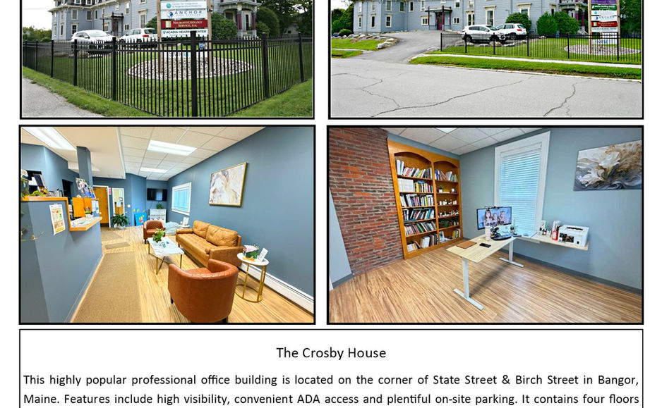Professional office building ideally located along a major travel corridor near Northern Light Hospital. This 1,790 SF first-floor suite offers convenient ADA access and abundant natural light throughout. Freshly painted walls and brand-new flooring create a clean, modern feel. The property also features 54 on-site parking spaces and easy access to and from State Street in Bangor. Available for occupancy on June 1, 2026!